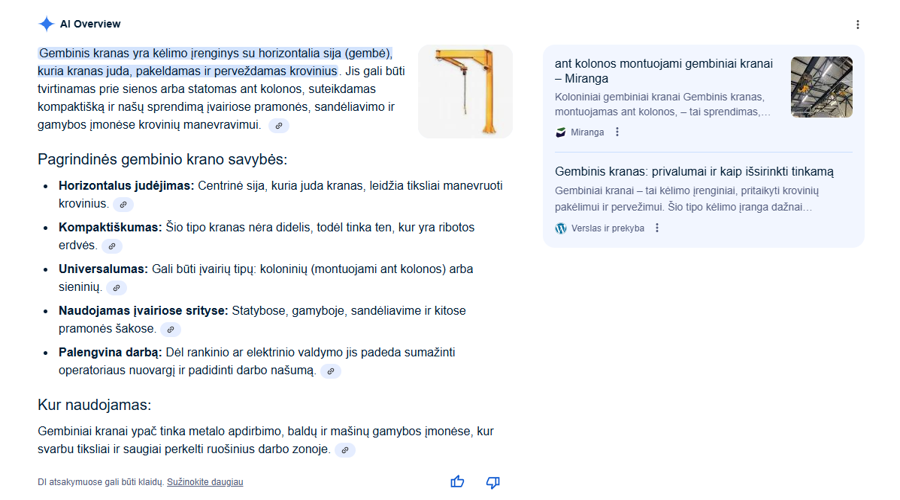Dėl nuoseklių SEO darbų šie raktažodžiai matomi Google AI Overview (featured snippet), suteikdami įmonei išskirtinį matomumą paieškos rezultatų viršuje.